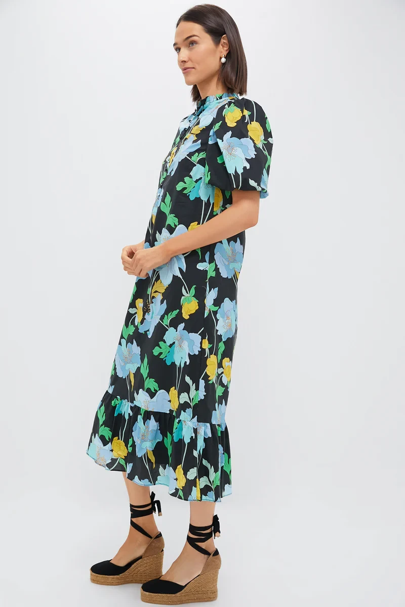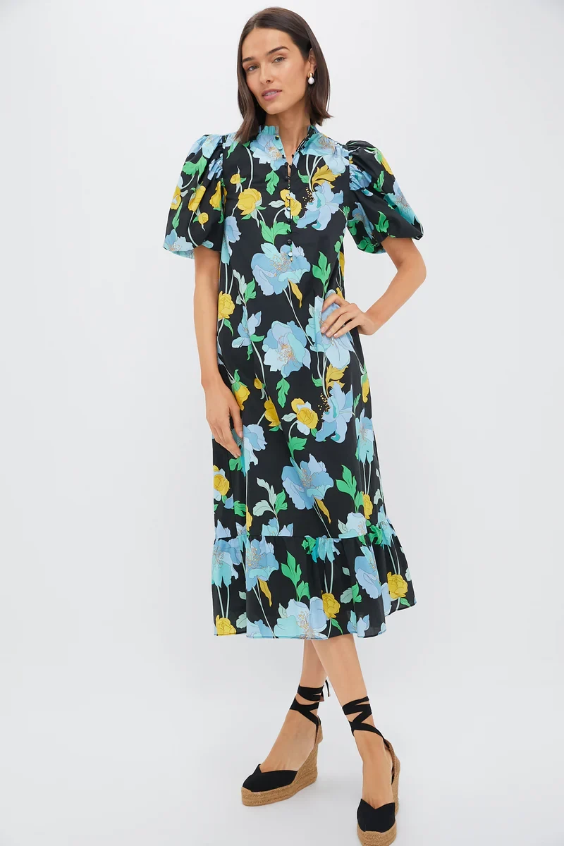 From workdays to weekends, the Mimi Midi Dress delivers easy elegance with a playful twist. Featuring a refined black and airy blue floral print, this feminine midi is full of thoughtful details—like short puff sleeves, a delicate ruffle collar, and a tiered ruffle hem that adds soft movement to its straight silhouette.