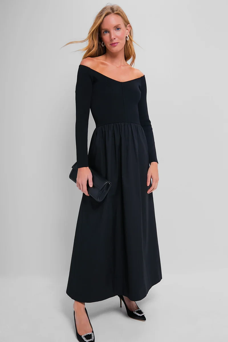 A black midi dress with timeless glamour, the Clea Dress channels Old Hollywood elegance with a modern twist. Featuring an off-the-shoulder neckline and a flattering fit-and-flare silhouette, this mixed-media gown is perfect for romantic evenings, formal dinners, or wedding celebrations. The stretch-knit bodice hugs comfortably, while the gathered cotton skirt adds dramatic movement.