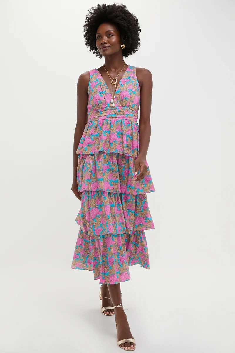 The Brilliant Pink Bonnie Dress is a celebration of bold femininity. Designed in a vibrant floral print, this tiered midi is the perfect choice for everything from sunlit brunches to barefoot garden parties. The flattering V-neckline, ruched empire waist, and breezy silhouette make it as comfortable as it is striking. Pair it with strappy sandals and a woven clutch for a look that radiates effortless joy.