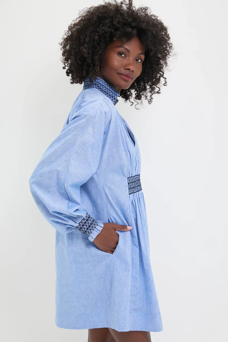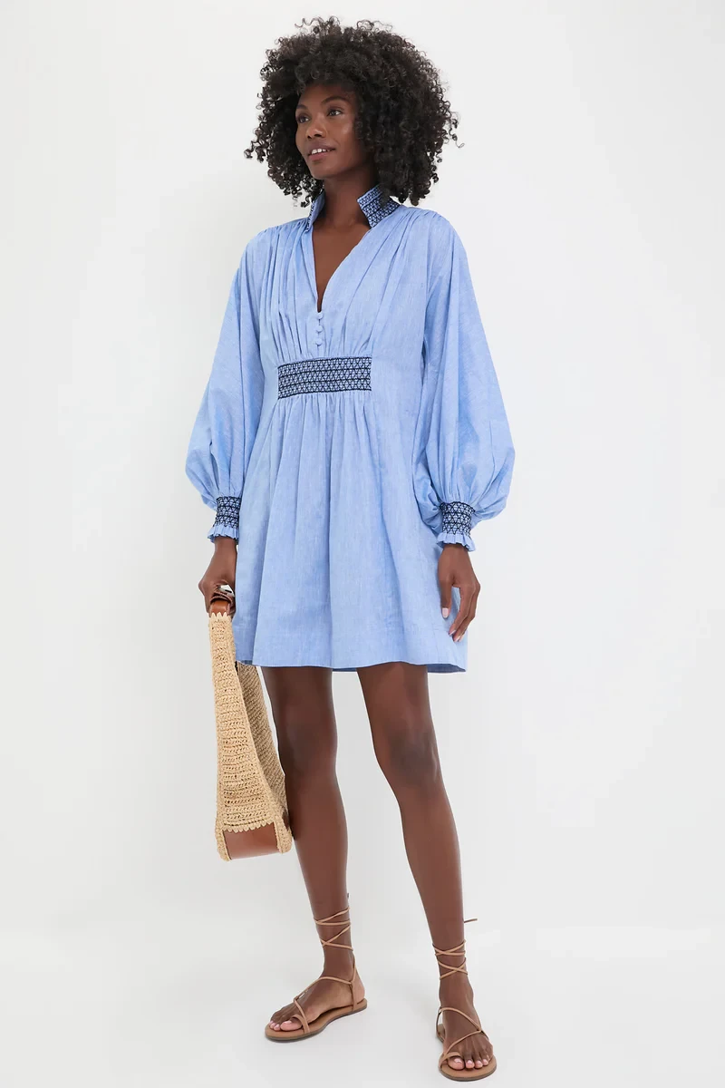 The Aubury Dress brings elevated charm to your everyday wardrobe. This chic mini is all about the details—featuring a stand collar, V-neckline with hook-and-eye closure, voluminous balloon sleeves, and intricate embroidery that frames the collar, cuffs, and bodice. Thoughtful cinching at the shoulders and waist creates a flattering silhouette while maintaining ease and comfort. Whether paired with tall boots in cooler months or sandals for sunny days, the Aubury is a standout staple year-round.