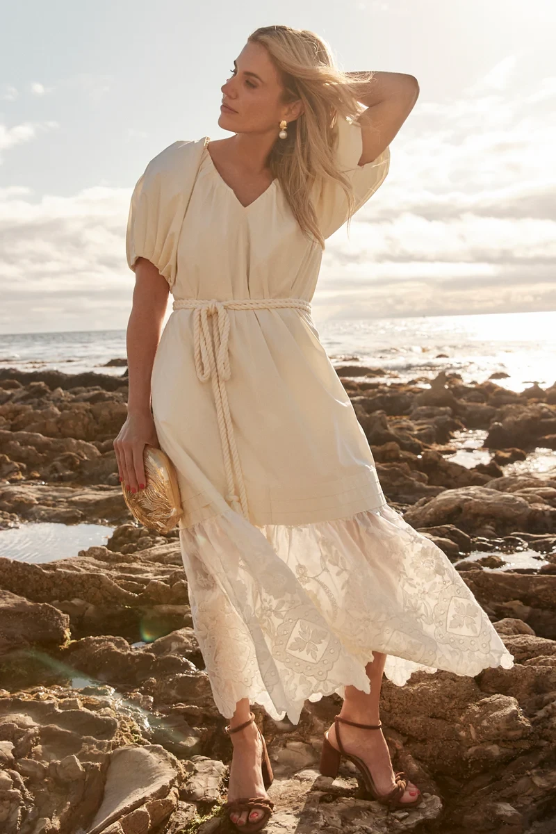 Shea’s summer soirée favorite, the Juniper Dress, blends ease and elegance with thoughtful details that feel both timeless and fresh. From nautical-inspired rope ties to airy lace paneling, this cotton midi is full of subtle charm. Pair it with the Dana Necklace, Ivy Sandals, and Adrian Tote for a full Shea-approved look.