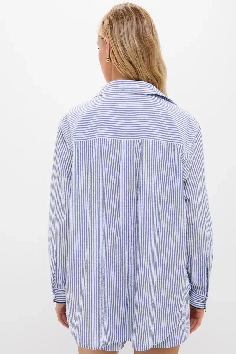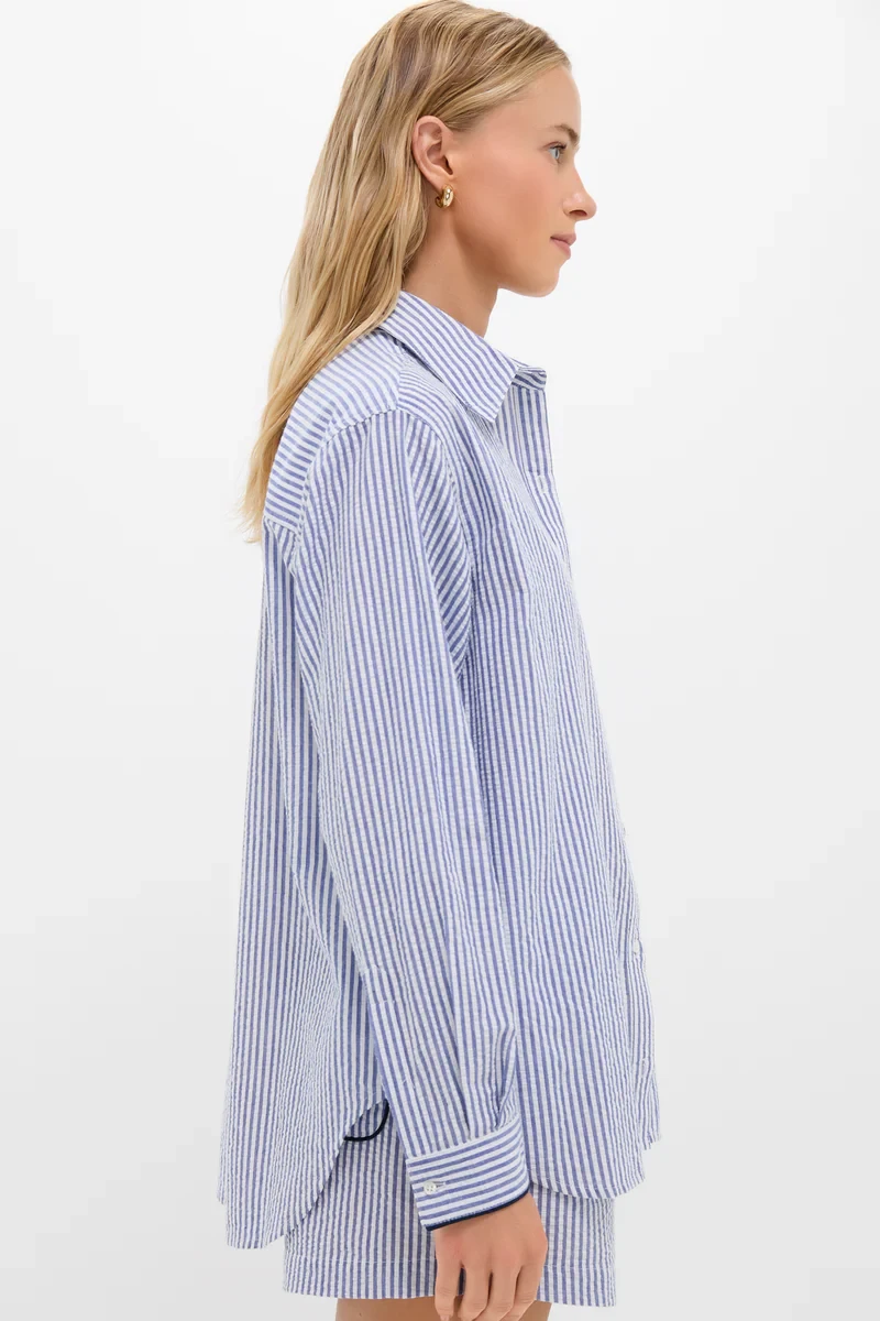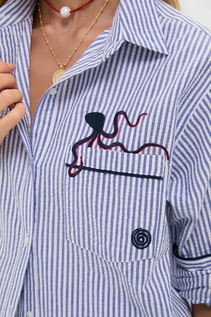 Embroidered Octopus Blue Stripe Seersucker Carden Button Down