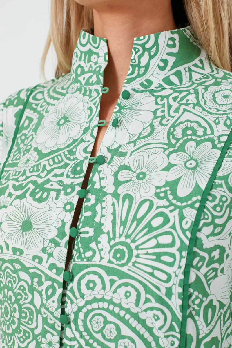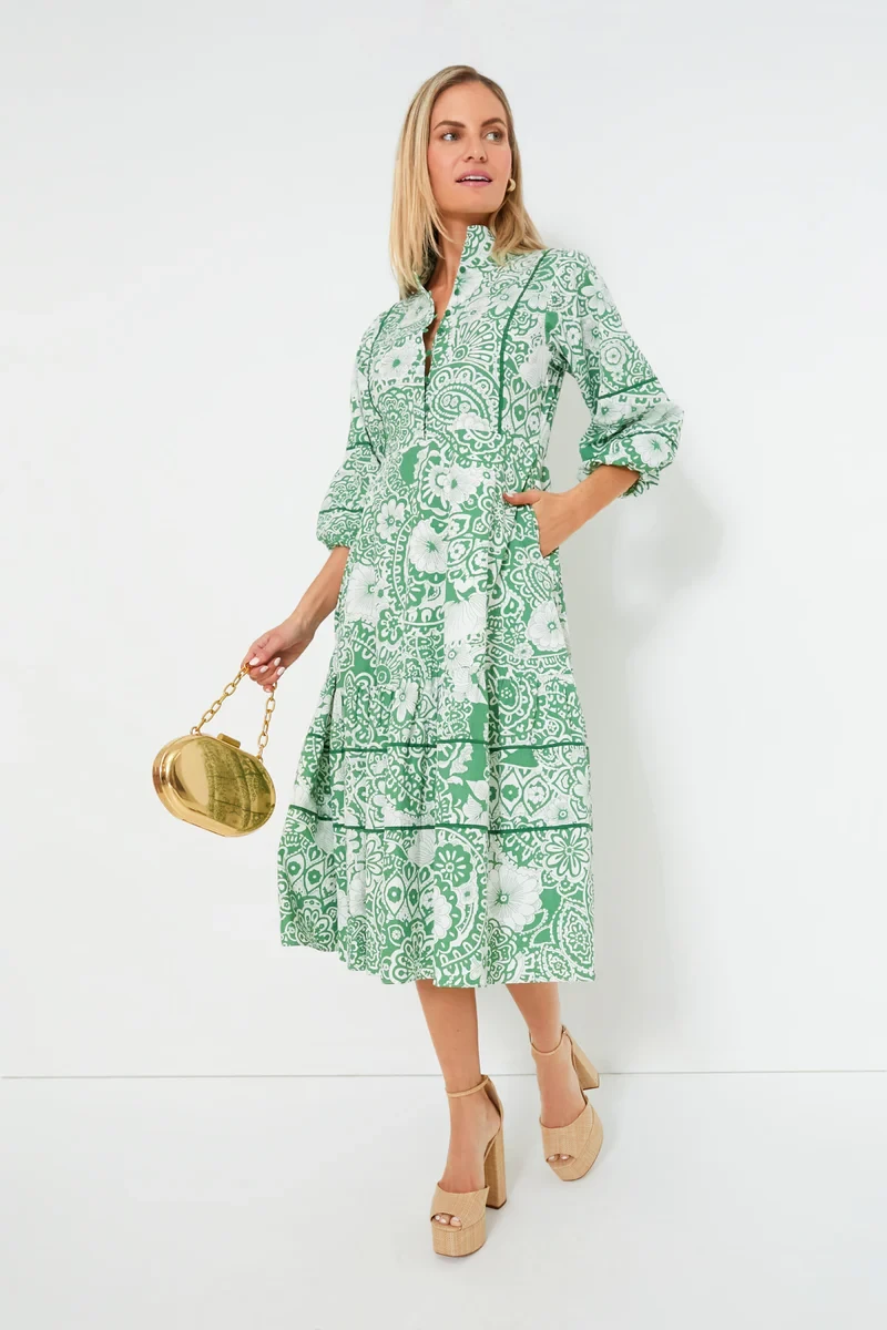 The Green and White Floral Hillsborough Dress is a standout style for sunny days, whether you’re headed to brunch, a garden party, or a stroll by the shore. With its flattering fit-and-flare silhouette, contrast piping, and vibrant green floral print, this midi dress is both playful and polished. Tiered skirt details and puff sleeves add extra charm, while pockets keep it practical.