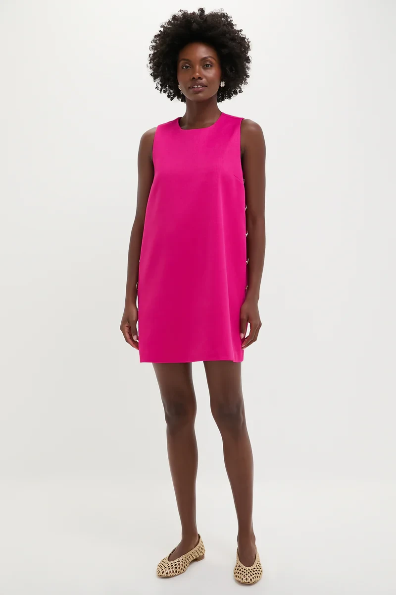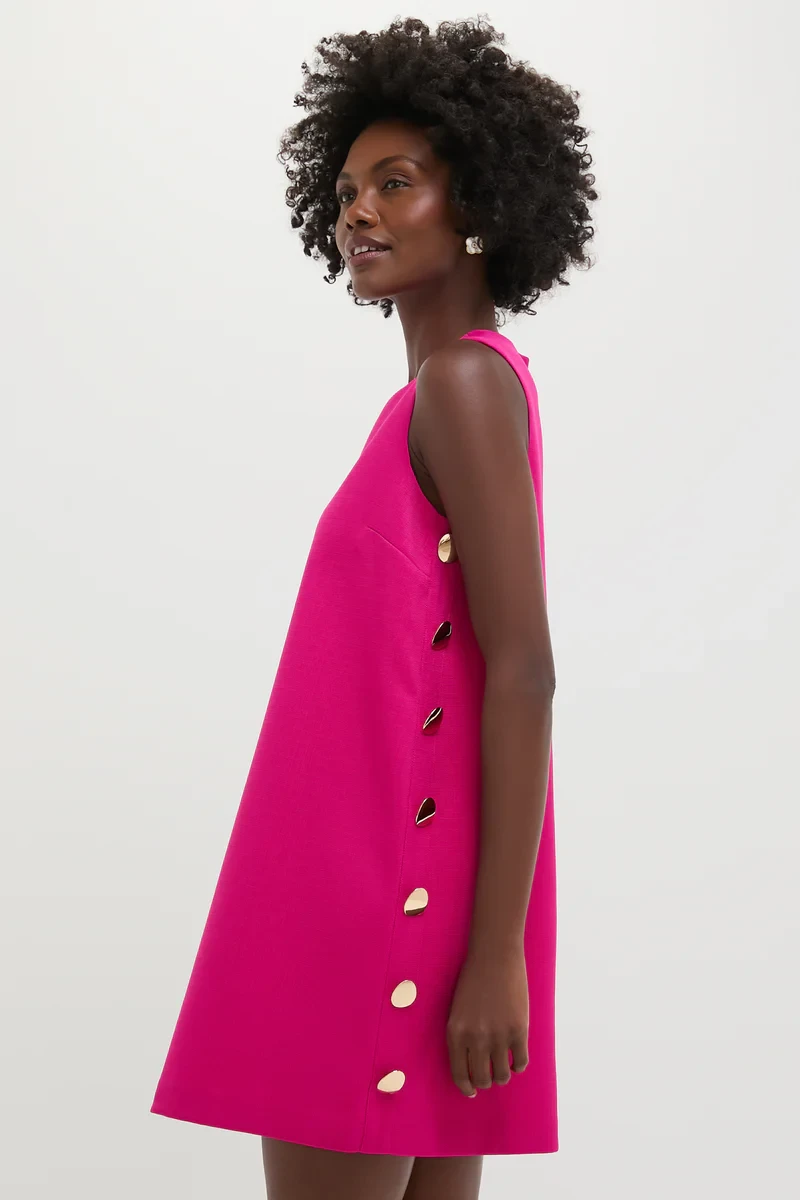 The Magenta Button Bitsy Dress turns heads with every step. Designed with a flattering swing silhouette and elevated by sleek gold side buttons, this mini brings just the right amount of drama. A scoop neckline and sleeveless cut keep things classic, while the vibrant magenta hue makes a statement all on its own. Whether you’re heading to a rooftop party or a summer soirée, just add strappy heels and subtle jewelry—this dress does the rest.