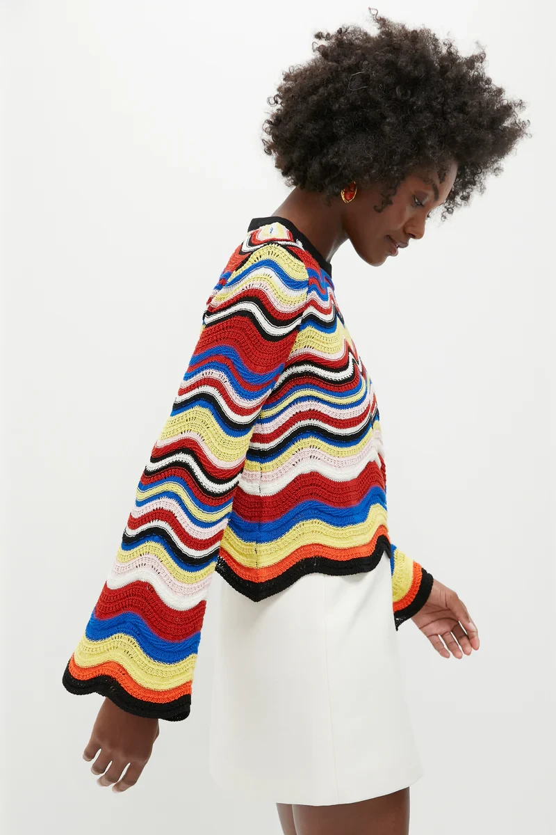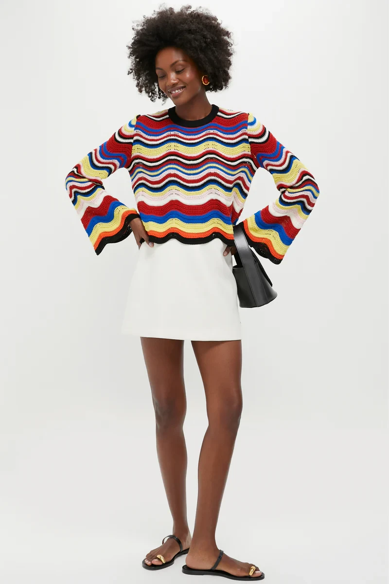 The perfect summer sweater has officially arrived. The Chevron Crop Sweater brings all the color and charm with its mood-boosting multicolor chevron knit. Cropped for an easy fit and finished with playful bell sleeves, it’s the ideal layer for breezy days and beachside evenings alike.