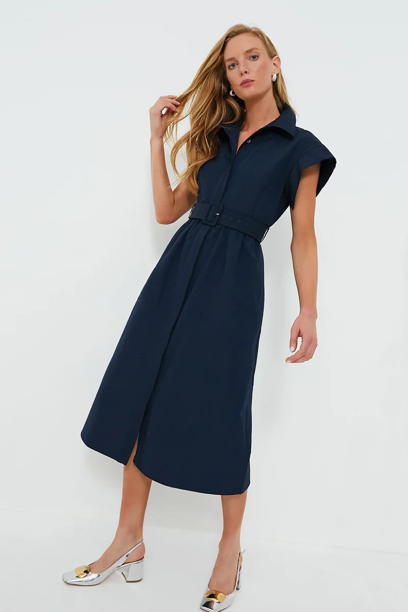 Refined, structured, and effortlessly elegant, the Navy Chloe Dress is a modern take on ladylike dressing. Crafted from textured moiré fabric, this polished midi features tailored elements like a crisp spread collar, short wing sleeves, and meticulous trapunto stitching throughout. The included adjustable belt allows you to define the waist or wear it loose for a more relaxed silhouette.