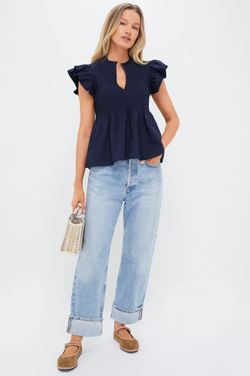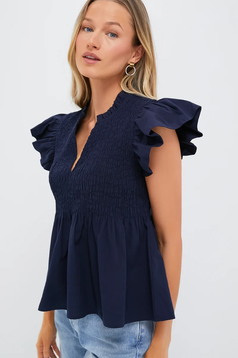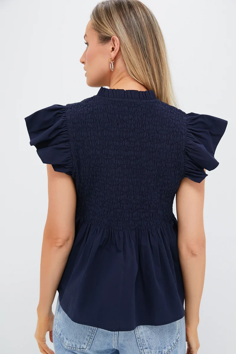 Navy Flutter Sleeve Smocked Irma Top