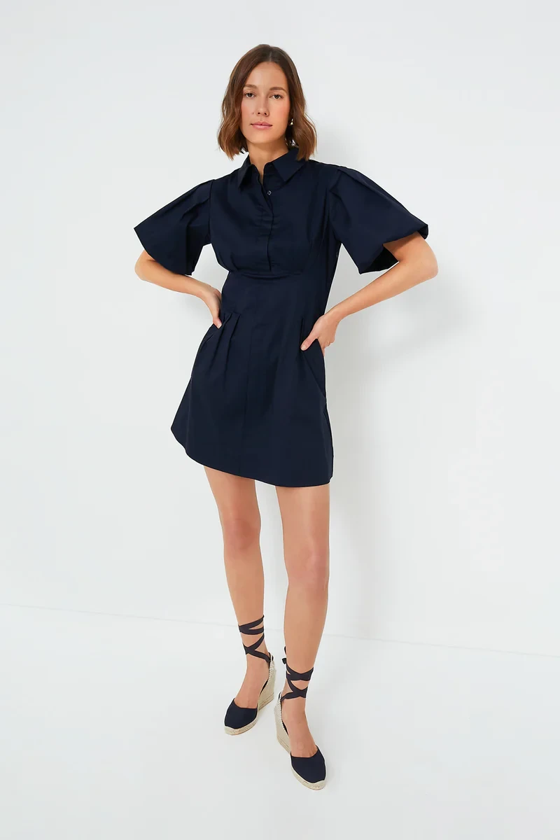 A polished mini that works overtime from brunch to cocktails—effortless style made easy.Details & Care Timeless, tailored, and subtly feminine, the Navy Mini Delaney Dress is your go-to for both work and weekend plans. Featuring a crisp spread collar, puff sleeves, and pleated waist detailing, this flattering mini creates a structured yet playful silhouette. Whether styled with gold accessories for brunch or elevated with heels for an evening out, this versatile piece is a true wardrobe hero. Design Features: Spread collar Short puff sleeves Full-length button front placket Side zip closure for ease Pleated detailing at the waist Fitted waist for a flattering shape Side seam pockets Fully lined Mini length Material: Body: 97% Cotton, 3% Spandex Lining: 96% Polyester, 4% Spandex Care Instructions: Hand wash cold Hang to dry Do not bleach A polished mini that works overtime from brunch to cocktails—effortless style made easy.