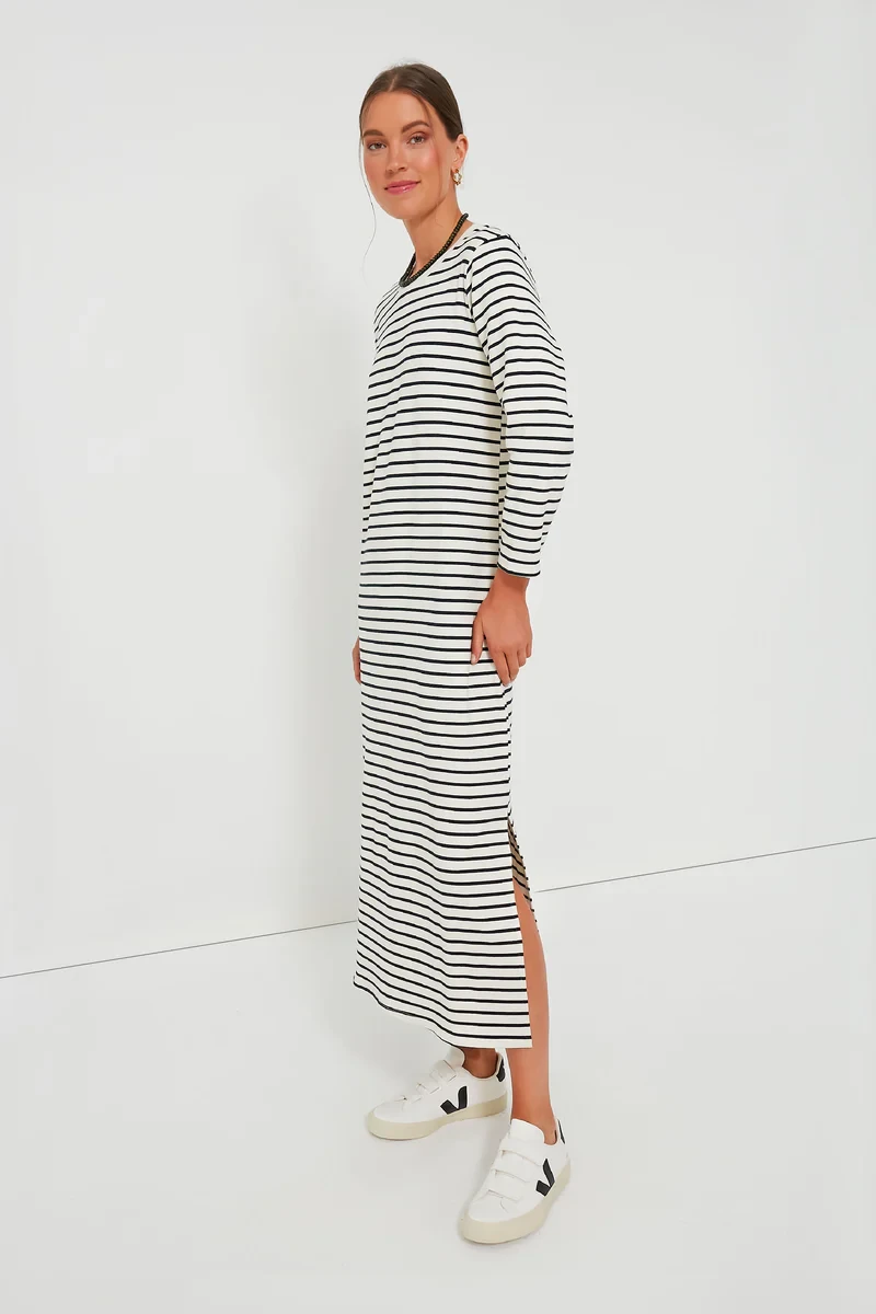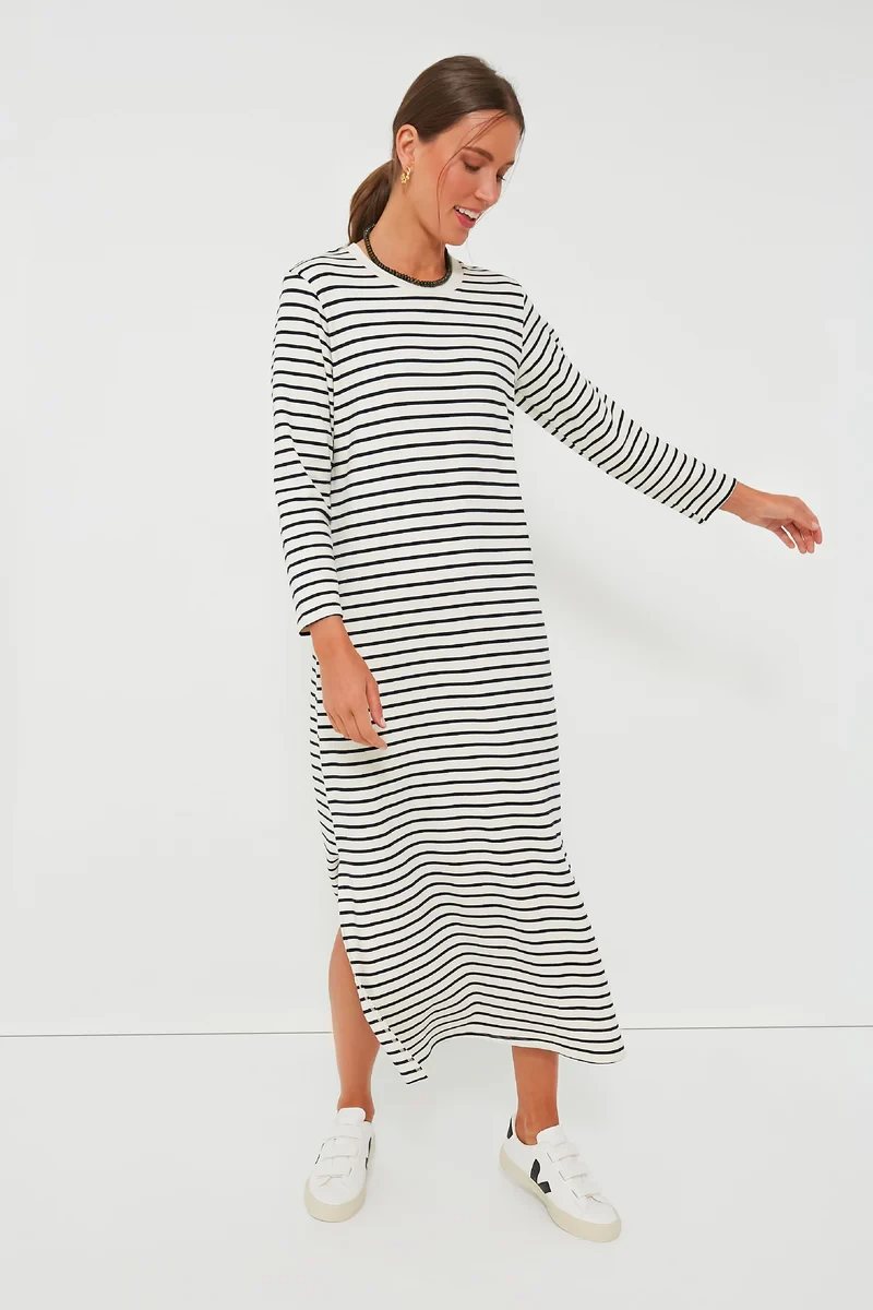 The Navy Stripe Gio Dress is everything we love about a t-shirt dress: comfortable, versatile, and effortlessly stylish. Designed with classic navy stripes, a crew neckline, and long sleeves, this maxi-length favorite also features side slits at the hem for added movement and comfort. Whether you’re heading out for errands or transitioning into evening plans, it pairs perfectly with everything from sneakers to flats.